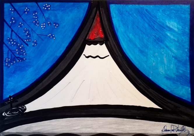 A tela "A montanha" representada pelo Monte Fuji, tem uma simbologia muito forte, representa a superação que o ser humano as vezes tem que enfrentar pra chegar ao sucesso profissional ou passar por alguma dificuldade, no canto esquerdo tem dois símbolos de impacto a cruz preta com um buraco negro que representa o vale dos suicidas que realmente existe no pé do monte mas pouco divulgado pelos japoneses ate pra quem vai visitar o monte isso não é falado e as cerejeiras embora sejam lindas em todos os aspectos mas pra eles representa a morte, o outro lado é o lado positivo da vida.
