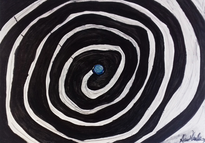 Esta tela representa os caminhos que o ser humano toma em determinadas fases da vida podendo ser beneficio ou maléfico. A seta azul representa o caminho positivo (voltando para cima) sendo ele de saúde, paz e prosperidade, o seta vermelho representa a negatividade (voltado para baixo) sendo doença, pobreza e conflito.