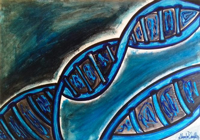 A tela “o DNA“ simbolizando a existência do ser humano já com sua forma física, com toda sua estrutura de corpo, mente e espirito, vivendo na Terra e cumprindo sua missão. Nesta tela podemos melhor simbolizar a existência do ser humano com a simbologia de seu DNA e de seus antepassados que são representados nessa tela através de pai e mãe.