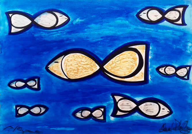 Nessa tela tem a representatividade da figura do peixe, que tem a cor do ouro e a cor da prata, representando