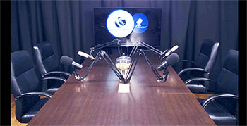 ( fotos do espaço da mesa com a imagem da logo do podcast sendo exibida no telão)
